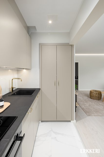 Tervetuloa tutustumaan tähän upeaan, juuri remontoituun kolmioon, jossa moderni design ja ajaton eleganssi kohtaavat. Asunnon sydämenä toimii tyylikäs keittiö, joka hurmaa hienostuneella värimaailmallaan ja käytännöllisillä ratkaisuillaan. Runsaasti kaappitilaa, laadukkaat materiaalit ja kaikki arjen mukavuudet tekevät keittiöstä paikan, jossa viihtyy niin arjessa kuin juhlassakin.