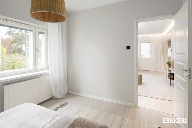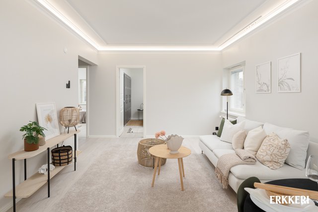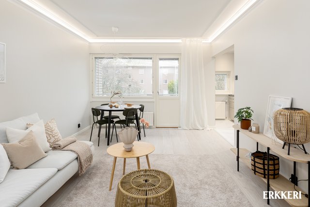 Asunnon värimaailma on raikas ja valoisa, korostaen tilojen avaruutta ja kodin modernia tunnelmaa. Valaistusratkaisut ovat huolella suunniteltuja ja poikkeavat edukseen – ne luovat tiloihin upean, viimeistellyn ilmeen.