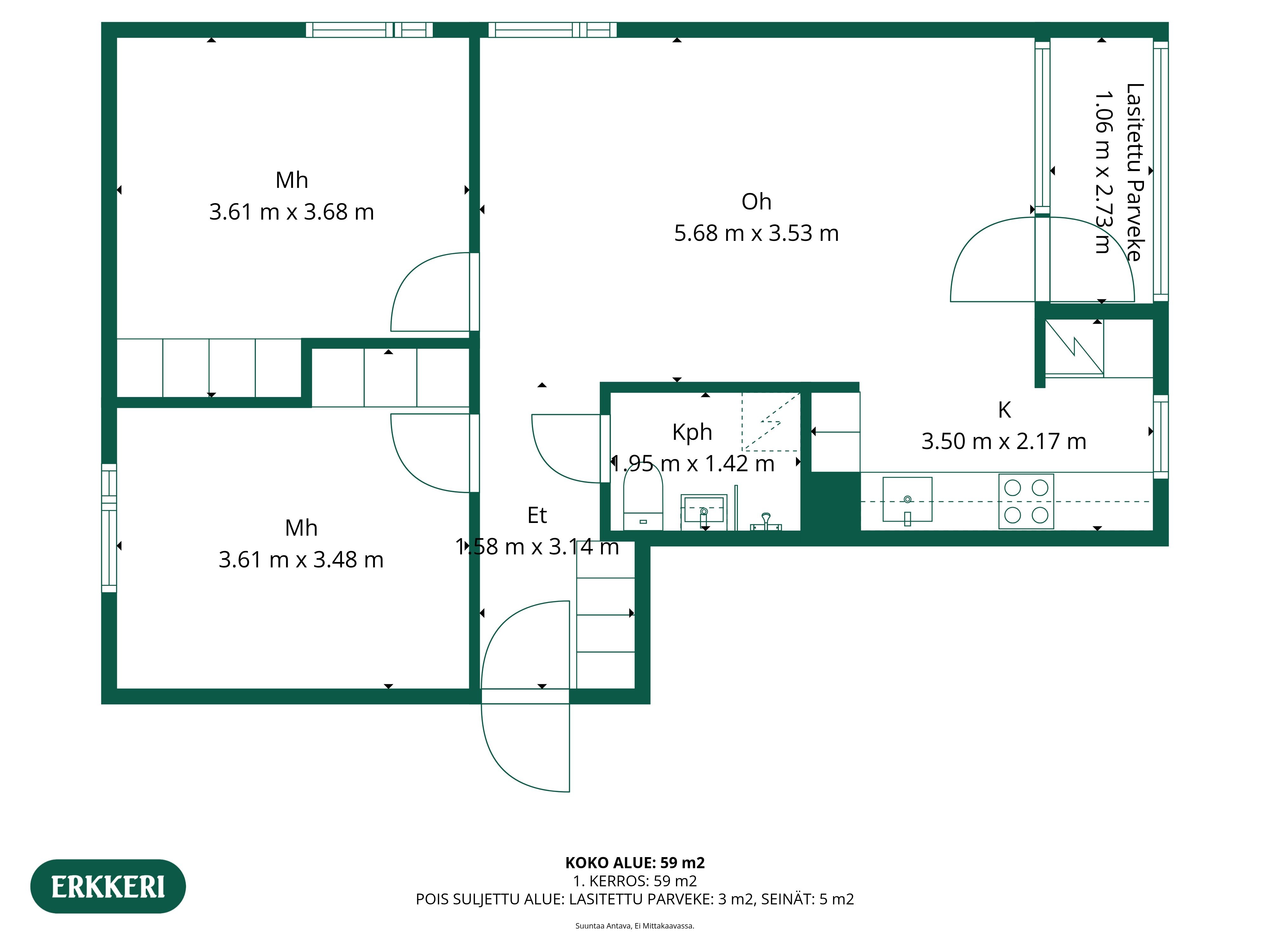 - Yhtiöjärjestyksen mukainen, (Pinta-ala ei ole tarkistusmitattu ja todellinen pinta-ala voi olla suurempi tai pienempi, kuin ilmoitettu)