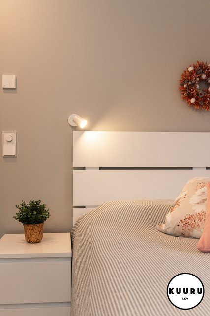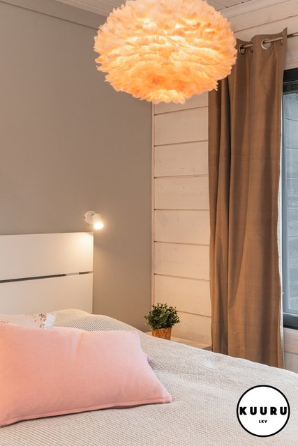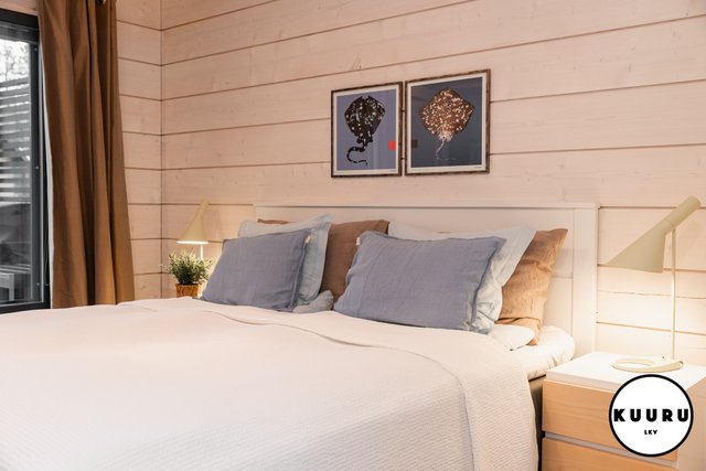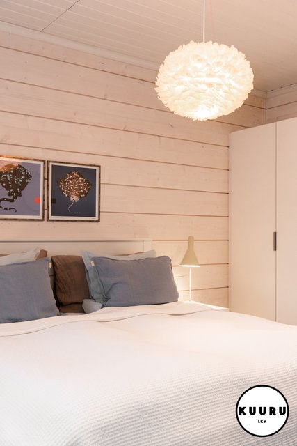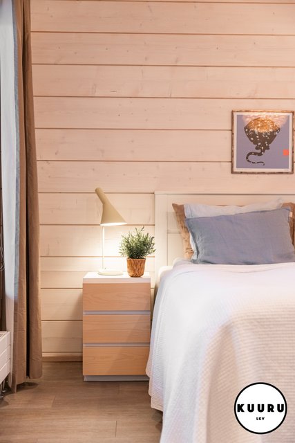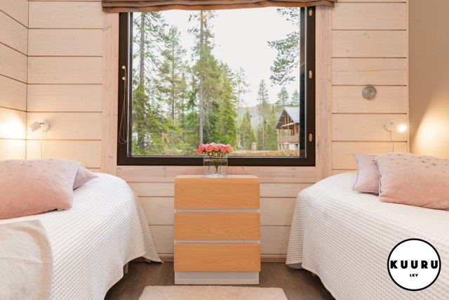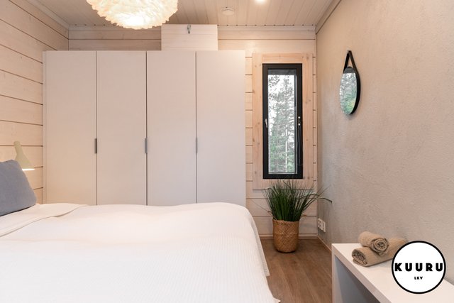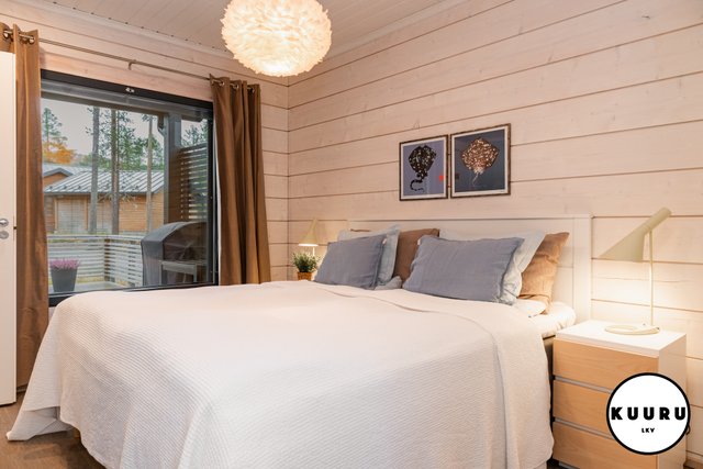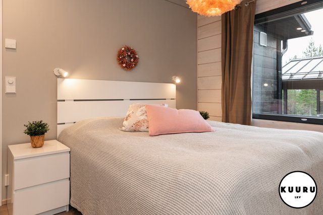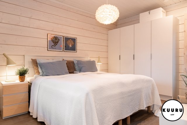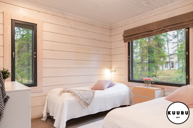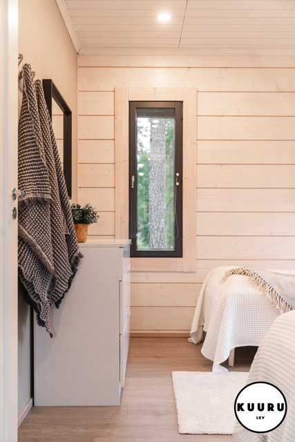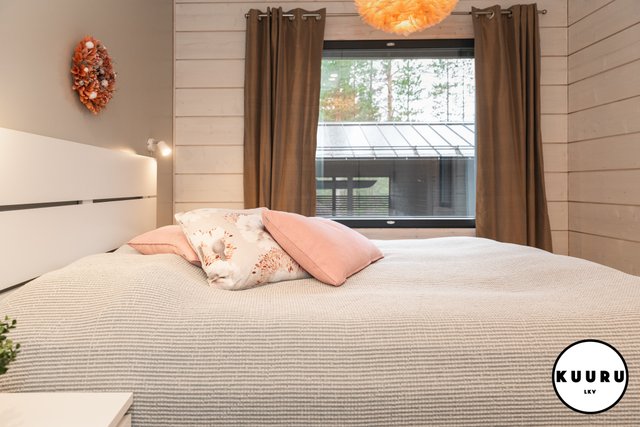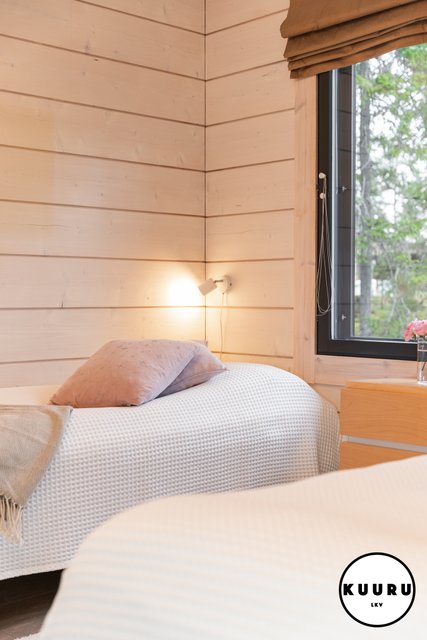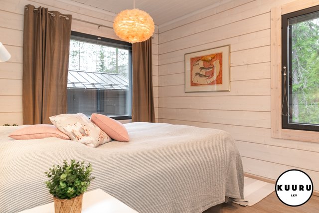 - Kohteesta löytyy kolme makuuhuonetta, joissa kaikissa on ikkuna ulos. Päämakuuhuone sijaitsee erillään kahdesta muusta makuuhuoneesta kohteen toisessa päässä, mikä tarjoaa lisää yksityisyyttä. Vaaleat hirsiseinät tuovat tilaan lämpöä ja valoisuutta.