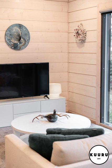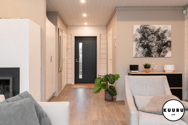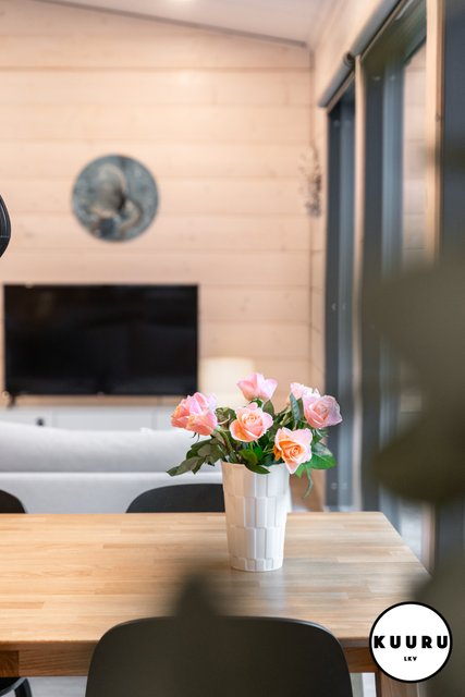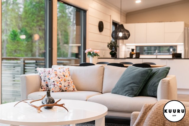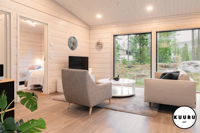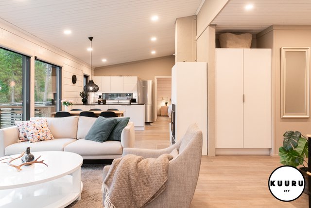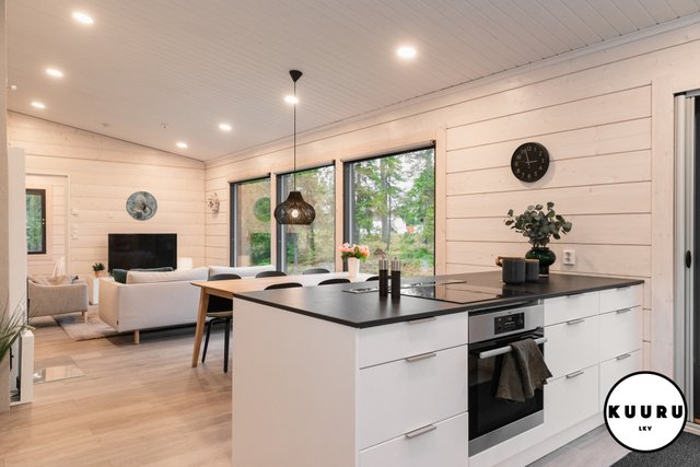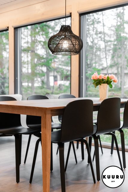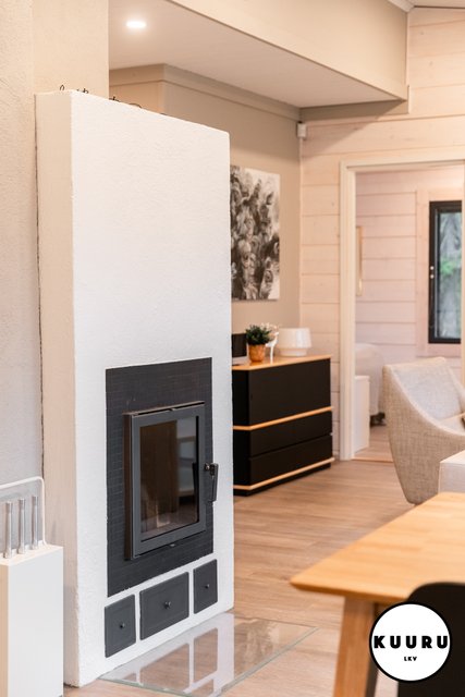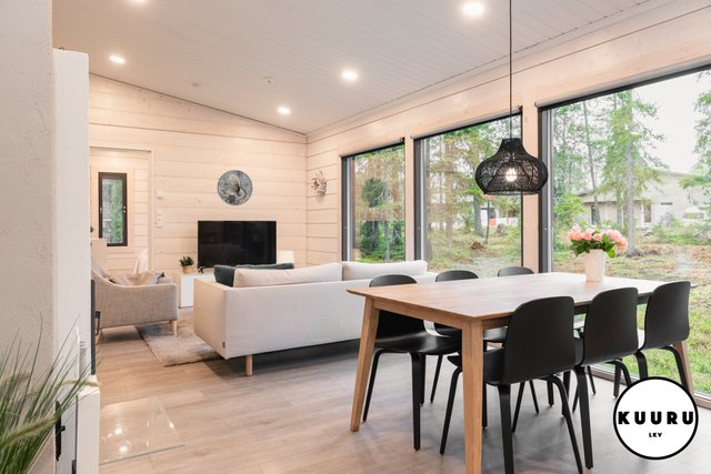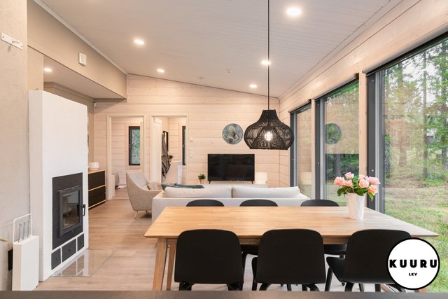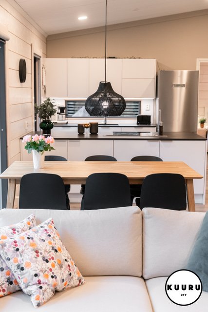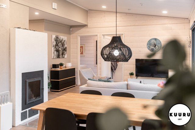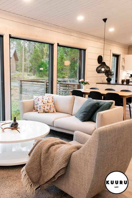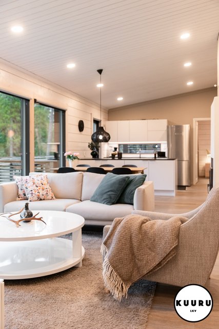 - Olohuoneen suuret ikkunat tuovat runsaasti valoa ja tarjoavat upeat maisemat ympäri vuoden. Olohuone sijaitsee keittiön ja ruokapöydän kanssa samassa avotilassa, mikä luo todella sosiaalisen ja viihtyisän tilan. Huoneessa on mukava aloittaa aamu ikkunoista tulvivan valon ja maisemien parissa, ja iltaisin siellä voi rauhoittua nauttien takkatulen tunnelmasta ja äänten lempeästä rytmistä.