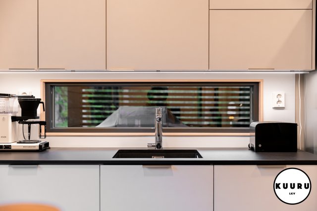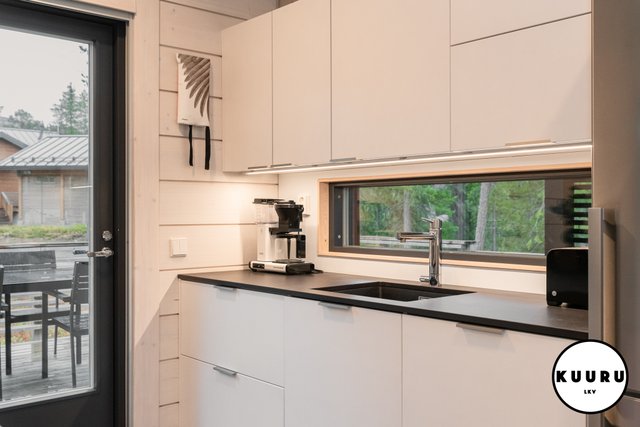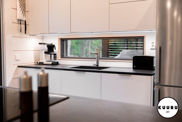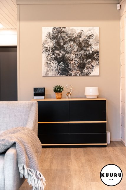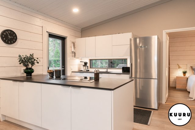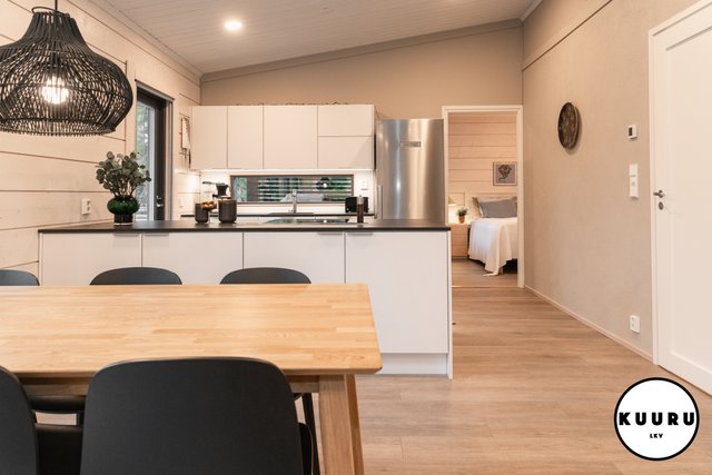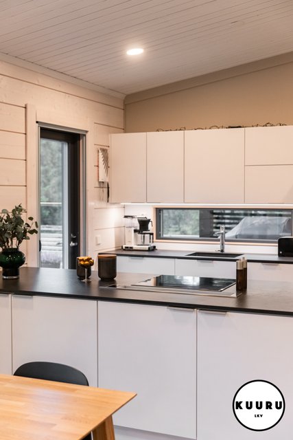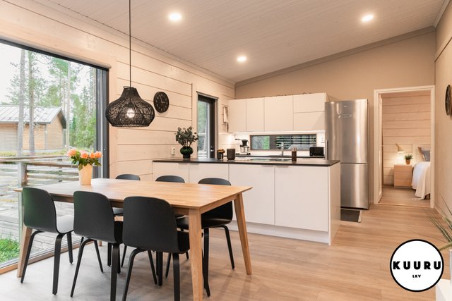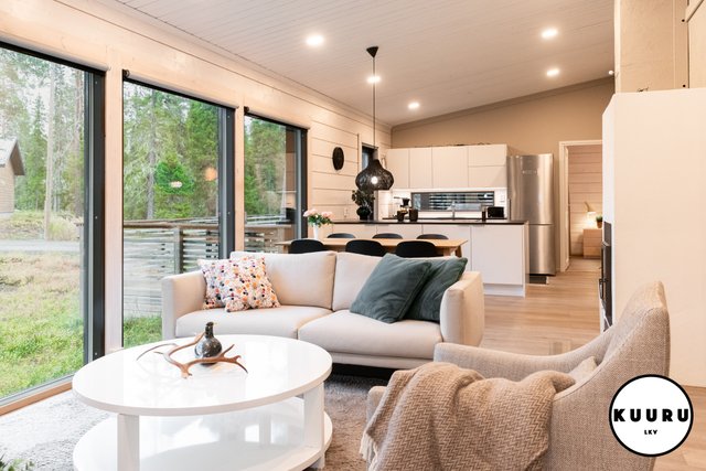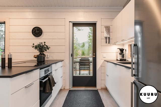 Sisällä sinut toivottaa tervetulleeksi avara ja valoisa olohuone, joka yhdistyy sulavasti moderniin keittiöön. Suuret ikkunat päästävät luonnonvalon tulvimaan sisään ja kehystävät tunturimaisemat kuin taulun. Keittiön saareke tekee ruoanlaitosta yhdessäoloa, ja tilan ilmavuus kutsuu viihtymään niin perheen kuin ystävien kanssa.