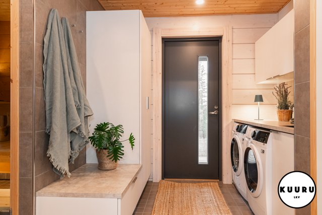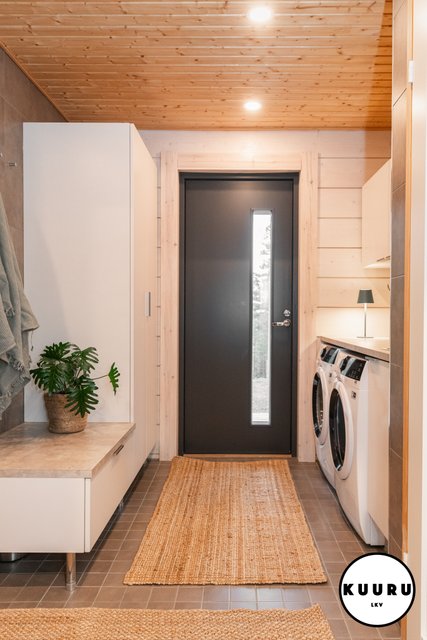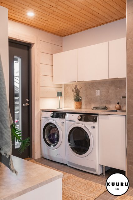 - Kohteen etupihalla on kaksi ulko-ovea: toinen johtaa suoraan eteiseen ja toinen kodinhoitohuoneeseen, mikä helpottaa lomailijan arkea.. Kodinhoitohuoneessa on kaappitilaa, pyykinpesukone, kuivausrumpu ja käsienpesuallas.