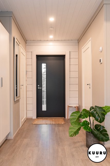 - Eteisen vieressä sijaitsee vaatehuone, joka tarjoaa runsaasti säilytystilaa
