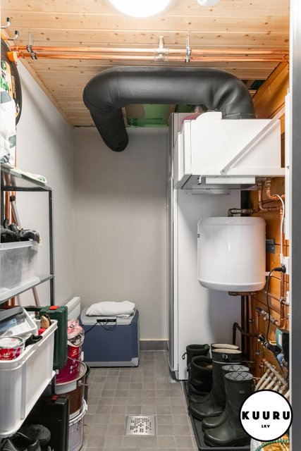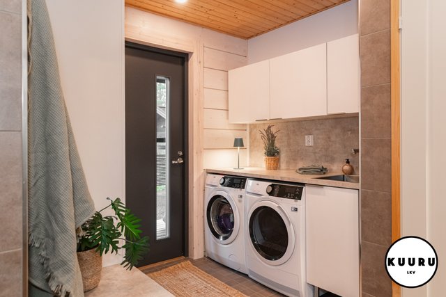 - Pesutila on sijoitettu käytännöllisesti kodinhoitohuoneen yhteyteen, mikä tekee arjen askareista sujuvia. Pesuhuoneesta on kätevä kulku ulos vilvoittelemaan, ilman että sisätilat kastuvat. Tilassa on lisäksi erillinen wc, joka tuo lisää mukavuutta.