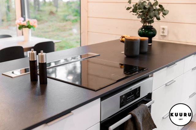 - Moderni keittiö saarekkeella tarjoaa runsaasti työtasotilaa ja tekee ruoanlaitosta seurallista – kokin ei tarvitse jättäytyä erilleen vieraistaan. Keittiö avautuu olohuoneeseen, ja suuret ikkunat tuovat tilaan valoa sekä paljastavat edessä avautuvan upean tunturimaiseman.