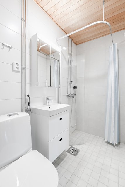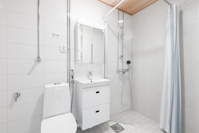 - WC-istuin, allaskaappi, peilikaappi, pesuallas, bidee-suihku, suihku, ja pesukoneliitäntä
