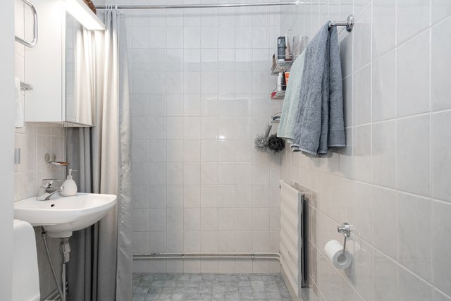 - WC-istuin, suihku, pesukoneliitäntä, peilikaappi, pesuallas, bidee-suihku, ja pyyhepatteri, kaapisto