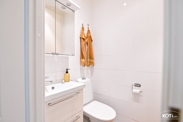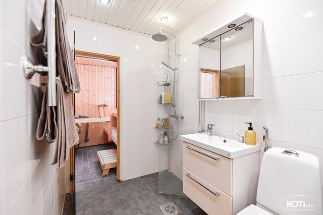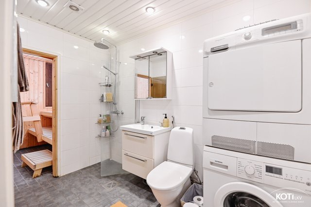 - WC-istuin, suihku, peilikaappi, lattialämmitys, pesukoneliitäntä, pesuallas, allaskaappi, ja suihkuseinä