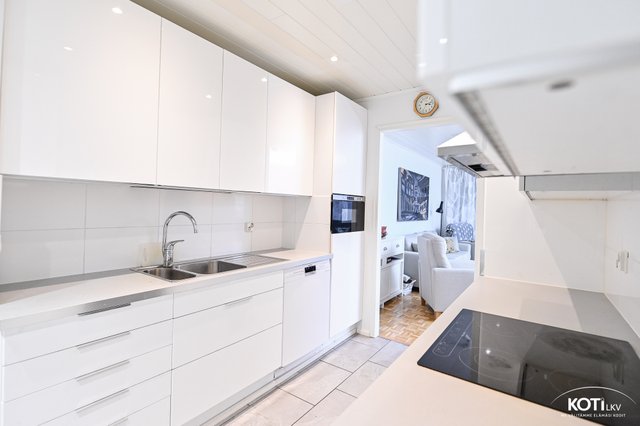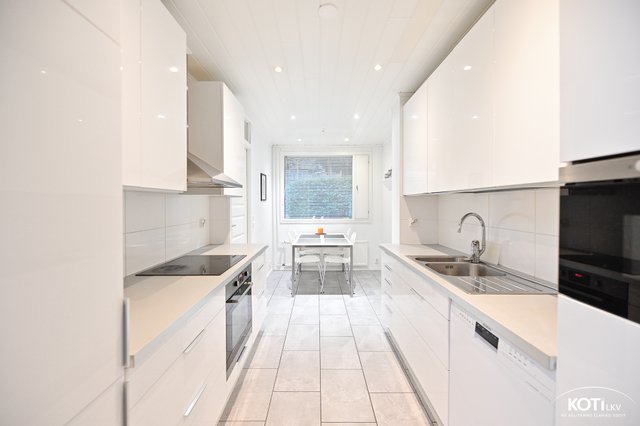 - Remontoitu tyylikäs keittiö, jossa laadukkaat rst-kodinkoneet ja vaalea laattalattia.