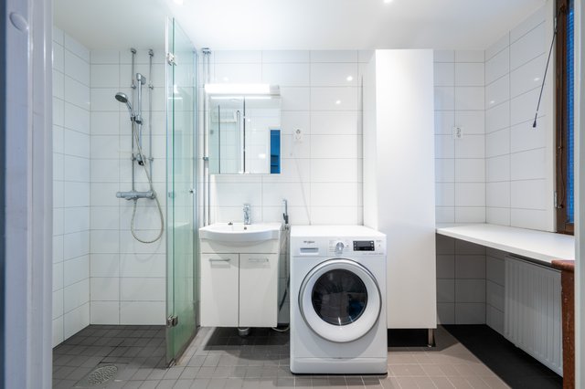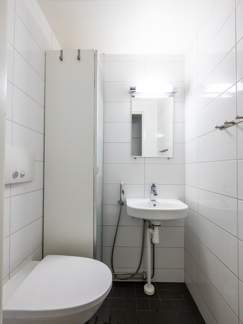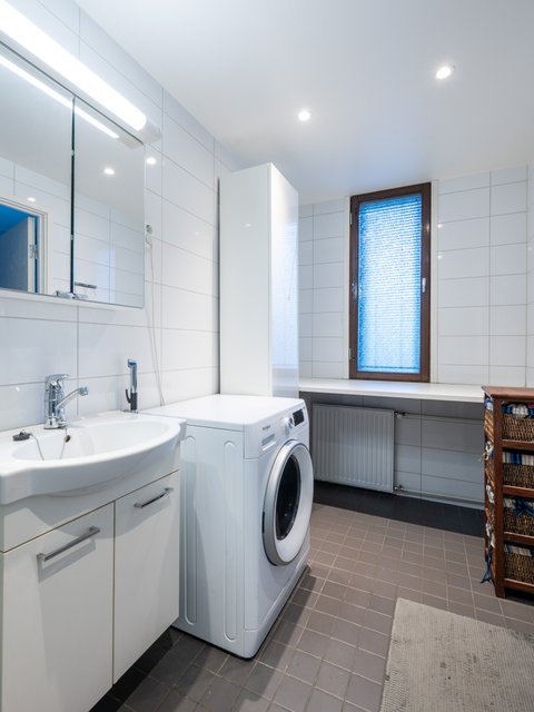- Remontoitu pesutila jossa varusteena on suihku, suihkuseinä, pesuallas, allaskaappi, peilikaappi ja pesukoneliitäntä. Lisäksi on pystykaappi ja tasotilaa. LATTIA: laatta SEINÄT: kaakeli