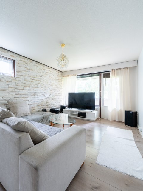- Avara olohuone, josta on kulku lasitetulle parvekkeelle. LATTIA: laminaatti SEINÄT: maali ja sisustuskivi