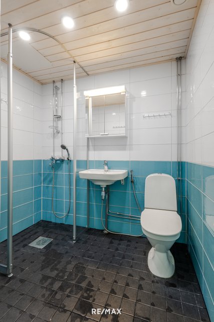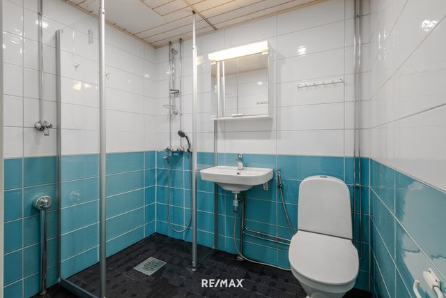 - WC-istuin, suihku, suihkuseinä (2 kpl), pesukoneliitäntä, peilikaappi, lattialämmitys, bidee-suihku, ja pesuallas