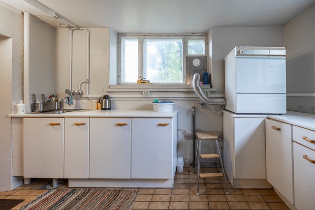 - Pesukoneliitäntä, lattialämmitys, pesuallas, lattiakaivo, pöytätaso, ja tila pesutornille