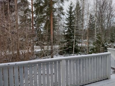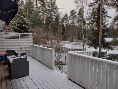 Olohuoneesta on käynti etelän suuntaan avautuvalle terassille ja takapihalle, missä riittää tilaa vaikkapa grillailla tai vain chillailla.