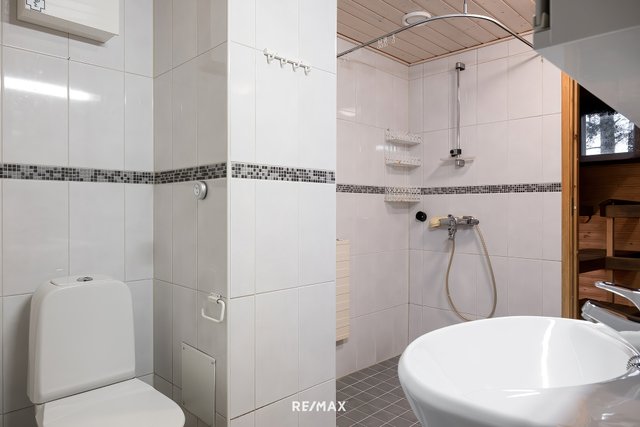 - WC-istuin, suihku, pesukoneliitäntä, pesuallas, allaskaappi, bidee-suihku, ja peilikaappi