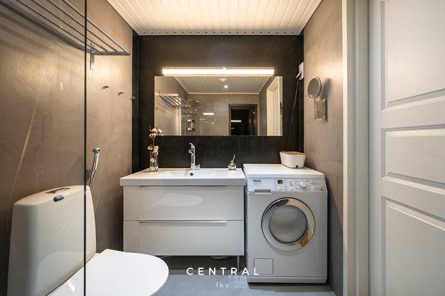 - WC-istuin, pesukone, peili, pesuallas, allaskaappi, pesukoneliitäntä, suihku, suihkuseinä, lattialämmitys, ja bidee-suihku