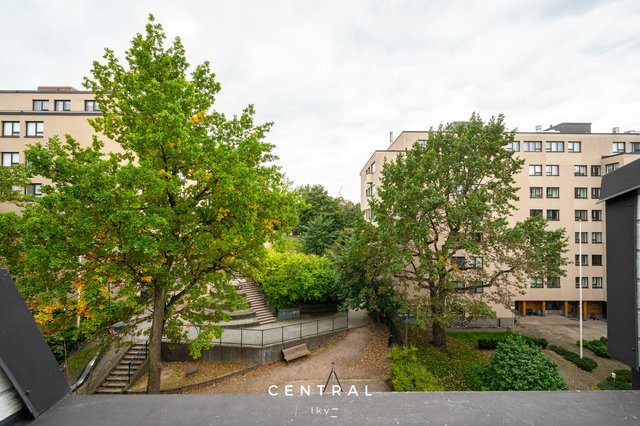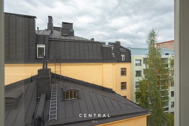 - Läpitalon kattohuoneistosta näkymät sisäpihalle ja kattoterassilta näkymät Sinebrychoffinpuiston suuntaan. Kahdet kattoikkunat luovat valoa ylös taivaalle.