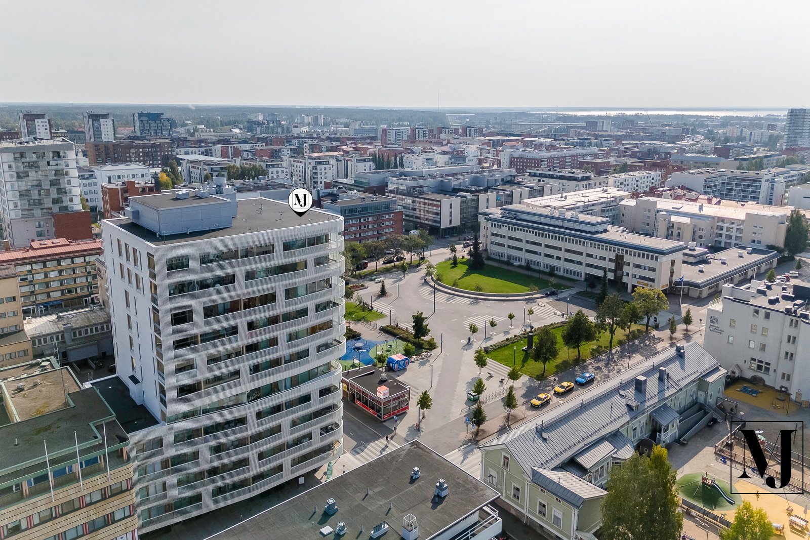 Oulun keskustassa, Albertinkadulla, sijaitsee tämä upea kaksio, josta avautuvat ainutlaatuiset näkymät Marskinpuistoon ja aina merelle saakka. Vuonna 2020 valmistunut 11. kerroksen koti yhdistää modernin asumisen, laadukkaat materiaalit ja vaikuttavat maisemat.