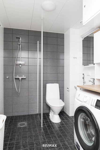- Suihku, wc-istuin, bidee-suihku, peilikaappi, pesuallas, pesukoneliitäntä, ja lattialämmitys