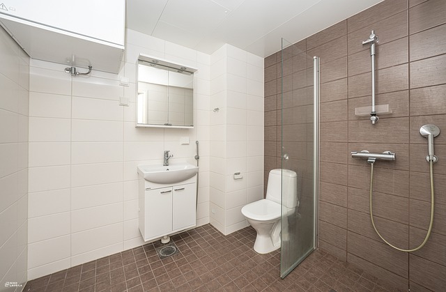 - Suihkuseinä, pesukoneliitäntä, wc-istuin, peilikaappi, suihku, lattialämmitys, ja kiinteät valaisimet