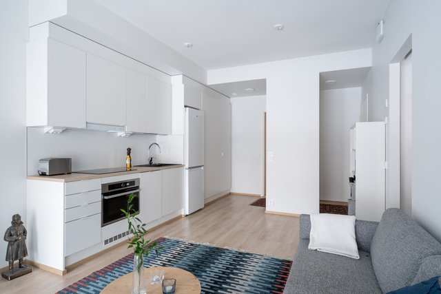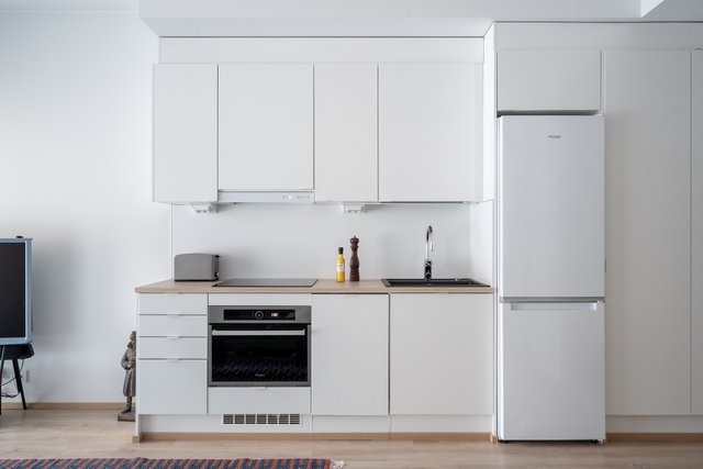 - Jääkaappi-pakastin, induktioliesi, erillisuuni, liesituuletin, astianperukone, mikroaaltouuni.