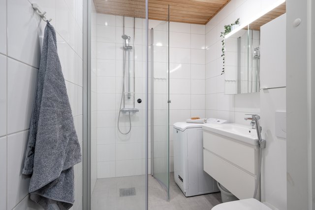 - Kokonaan laatoitettu. Wc, suihku, peili- ja allaskaapit, bidee-suihku.