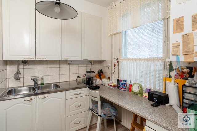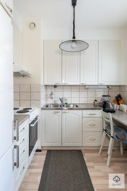 Keittiö on varusteltu nykyaikaisilla laitteilla, ja kylpyhuoneessa on pesukoneliitäntä, mikä helpottaa arkea. Tilava olohuone ja makuuhuone tekevät asunnosta toimivan ja kodikkaan kokonaisuuden.
