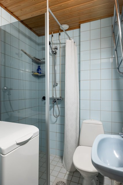 - WC-istuin, suihku, bidee-suihku, peilikaappi, pesukoneliitäntä, suihkuseinä, ja pesuallas