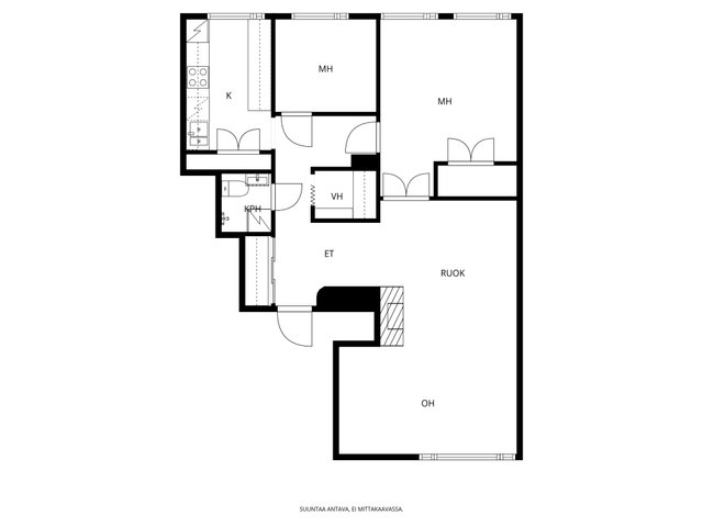 - Huoneiston pinta-ala on yhtiöjärjestyksen, isännöitsijäntodistuksen ja myyjän ilmoituksen mukaan 80 m². Edellä mainittu pinta-ala saattaa tämän ikäisessä kohteessa poiketa olennaisestikin huoneiston nykyisen ja rakentamisaikaisen mittaustapojen ja standardien mukaan laskettavasta pinta-alasta. Huoneiston todellinen pinta-ala voi siis olla yhtiöjärjestyksessä, isännöitsijäntodistuksessa ja esitteessä mainittua pienempi tai suurempi.