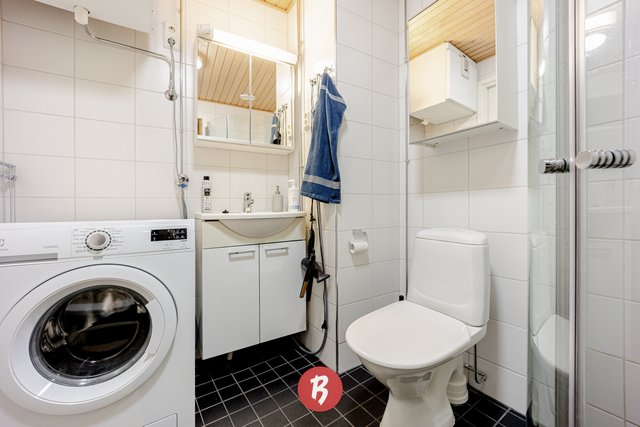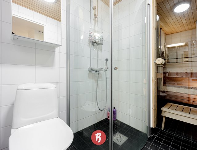 - Allaskaappi, pesuallas, lattialämmitys, suihkuseinä, pesukoneliitäntä, wc-istuin, ja suihku