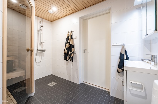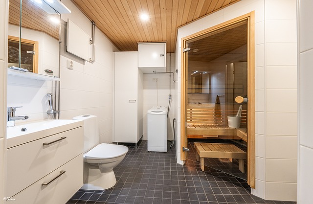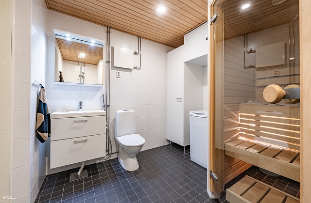 - Suihkunurkkaus/-suihku, käsienpesuallas, allaskaappi, peilikaappi, korkea kaappi, pesukoneliitäntä, wc-istuin, IV-kone. Lattia ja seinät laattaa. Sauna; sähkölämmitteinen kiuas, laattalattia ja seinät puuta.