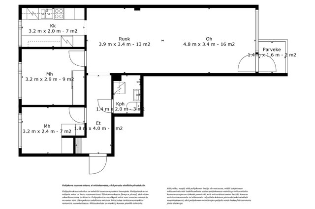 - Pinta-alaa ei ole tarkistusmitattu. Edellä mainittu pinta-ala saattaa tämän ikäisessä kohteessa poiketa olennaisestikin huoneiston nykyisen ja rakentamisaikaisen mittaustapojen ja standardien mukaan laskettavasta pinta-alasta. Huoneiston todellinen pinta-ala voi siis olla yhtiöjärjestyksessä, isännöitsijäntodistuksessa ja esitteessä mainittua pienempi tai suurempi.