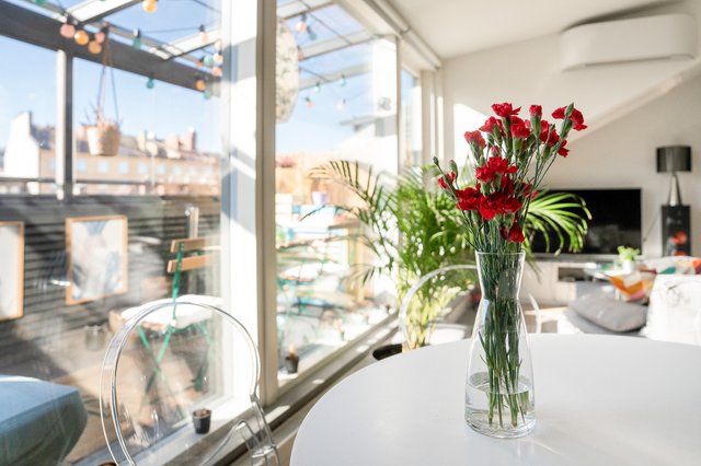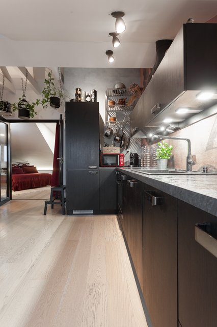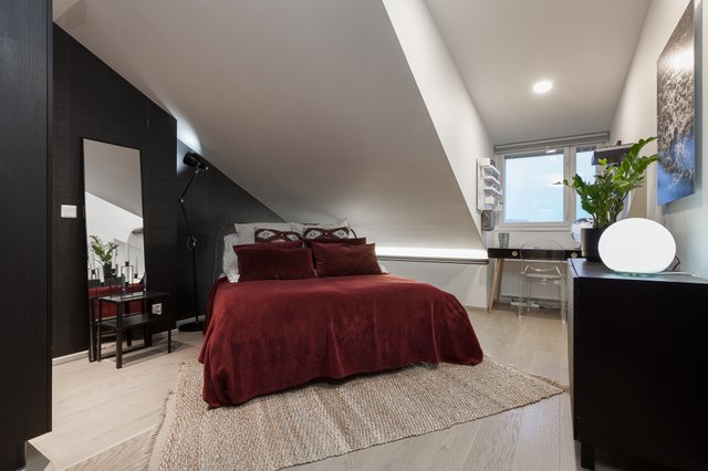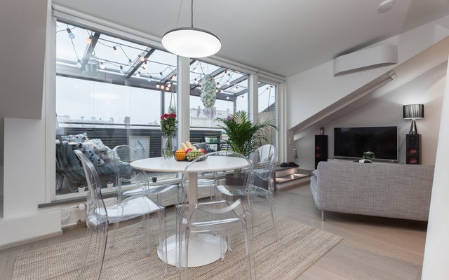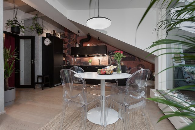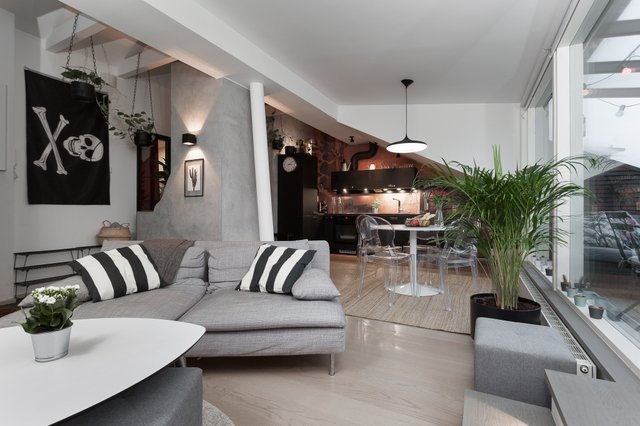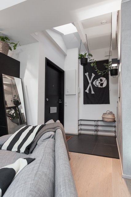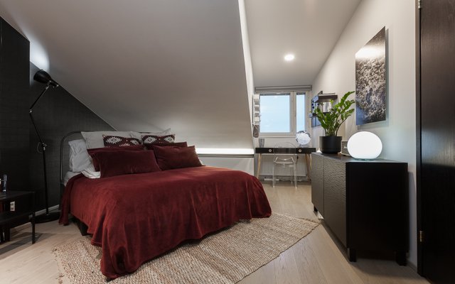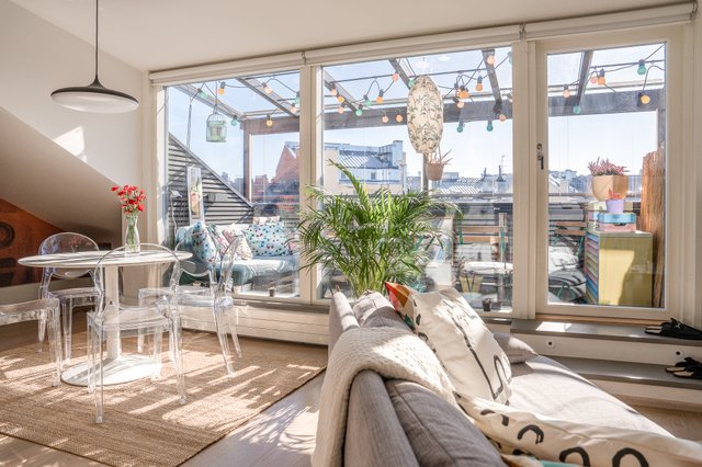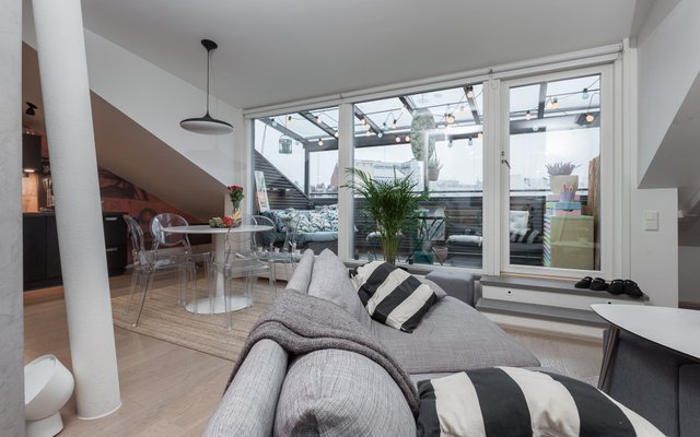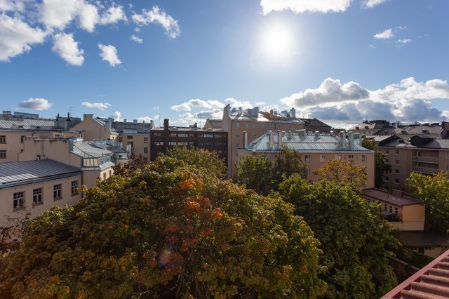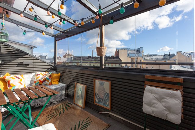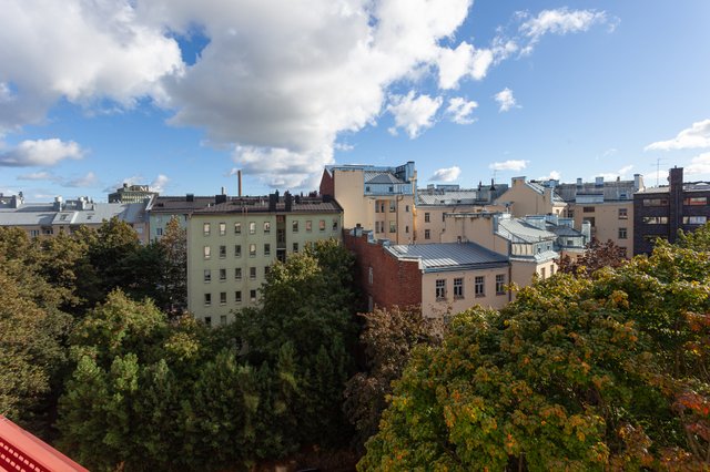Tervetuloa tähän kahdeksannen kerroksen uniikkiin ullakkoasuntoon Harjun ja Vallilan rajalla.