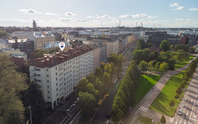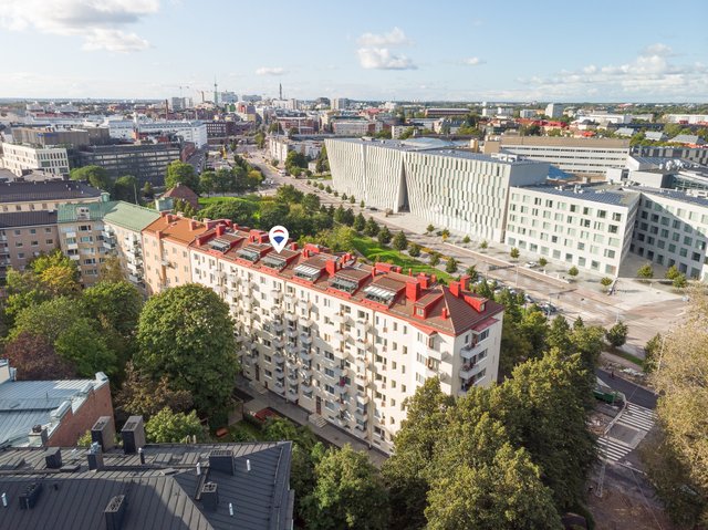 Asunto on rakennettu vuonna 1953 valmistuneen hissillisen talon ylimpään kerrokseen (8/8). Huoneiston lattiapinta-ala on pinta-alamittauksen mukaan 59,56 m² + 5,62 m² parveketerassi. Monessa Helsingin ullakkoasunnoissa ei ole terassiparveketta, mutta tässä asunnossa sellainen on ja ai että mitkä näkymät! Terassiltaparvekkeelta aukeaa todella avarat sisäpihanäkymät etelään ja vastakkaisille taloille on reilusti etäisyyttä. Terassiparveke toimii tässä upeasti asunnon jatkeena keväästä syksyyn. Kuvittele tämä: Olet terassiparvekkeen sohvalla, nautiskelet punaviinistä ja ihailet syksyn ruskaa juuri päättyneen grillauksen jälkeen. Ei nyt ihan huono!