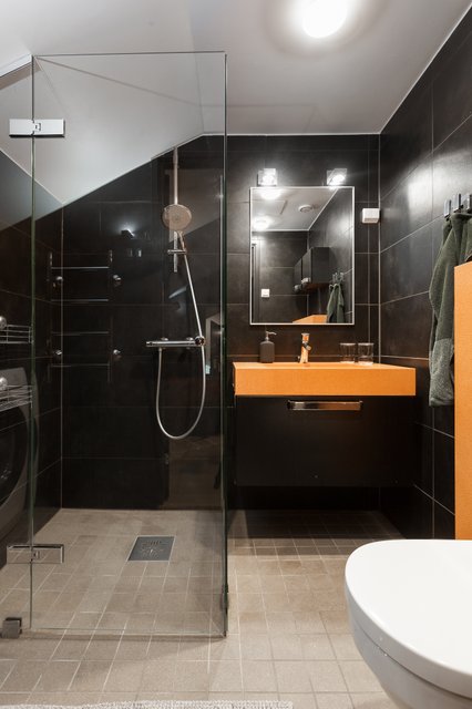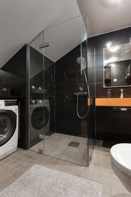 - WC-istuin, suihku, suihkuseinä, pesukoneliitäntä, peilikaappi, ja allaskaappi