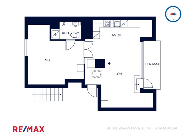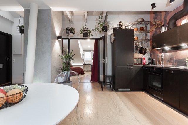 Olohuoneen ikkunat ulottuvat lähes lattiasta kattoon. Tämä yhdistettynä 8. kerrokseen ja ilmasuunta tekee asunnosta todella valoisan! Asunto ei kuitenkaan kuumene liikaa, sillä täällä on käytössä ilmanlämpöpumppu. Keittiön kohdalle jää kivasti tilaa ruokaryhmälle ja eteisen vieressä on luonnollinen paikka sohvaryhmälle ja telkkarille. Eteisessä on kattoikkuna lisäämään asunnon valoisuutta. Makuuhuoneeseen mahtuu leveä sänky ja työpiste ja kylpyhuoneessa on oma paikka pyykinpesukoneelle. Olohuone hurmaa rohkeilla ja trendikkäillä väreillään, joita täydentää leveä, vaalea puunsävyinen parkettilattia.