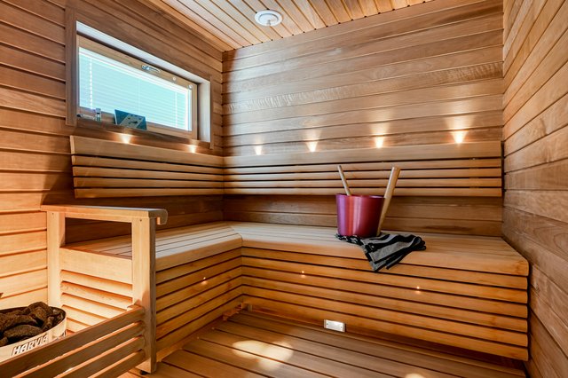Pesutilat ja sauna on toteutettu tyylillä ja laadulla. Kaksi sadesuihkua, erillinen wc sekä Harvian kiuas ja jättiläistuijasta tehdyt lauteet luovat spa-henkisen tunnelman. Pukeutumishuoneesta on käynti terassille ja siellä sijaitsee myös oma viini/ jääkaappi – täydellinen yksityiskohta saunaillan kruunaamiseen. Kodista löytyy yhteensä kolme wc:tä, joten tilat palvelevat vaivattomasti myös suurempaa perhettä.