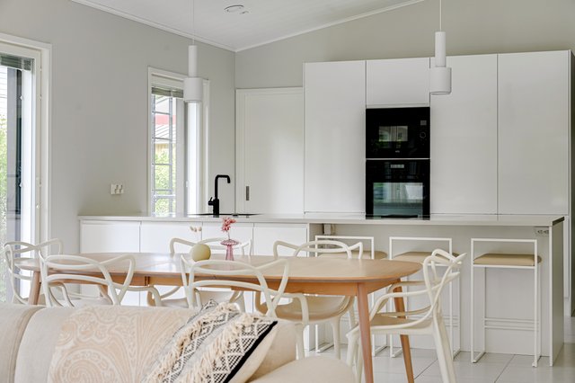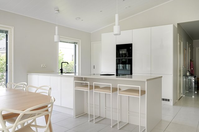 Jo sisään astuessa tunnelma on avara ja kutsuva. Korkea huonekorkeus ja suuret ikkunat tulvivat tiloihin valoa. Olohuone, ruokailutila sekä keittiö muodostavat yhtenäisen ja harmonisen kokonaisuuden, jossa viihtyy niin arjessa kuin juhlassakin. Laadukkaassa Petra-keittiössä on kivitasot, saareke integroidulla liesituulettimella sekä huippuluokan AEG:n ja Tesla Elican kodinkoneet. Keittiössä on lisäksi erillinen ruokakomero, joka tuo käytännöllistä lisätilaa ja helpottaa arkea.