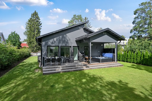 - Iso kaakkoon avautuva terassi, johon mahtuu grilli ja ruokailuryhmä. Porealtaan kohdalla terassi on katettu.