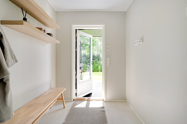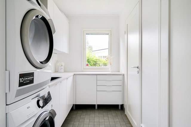 Kodinhoitohuone on suunniteltu arjen sujuvuutta varten: runsaasti säilytystilaa, pyykkikaapit, pöytätaso ja paikka pesutornille. Lämmin varasto ja autokatos tuovat käytännöllisyyttä, ja pihapiiri on viimeistelty viihtyisäksi ja helppohoitoiseksi.