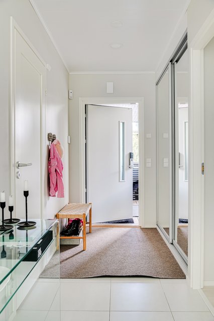 - Pukeutumishuoneesta kulku pesutiloihin ja terassille, jossa katettu poreallas. Tilassa myös viini-/jääkaappi Ruokailutila sijoittuu avokeittiön ja olohuoneen väliin, ja sinne mahtuu vaivatta suurempikin ruokailuryhmä. Tilava eteinen.