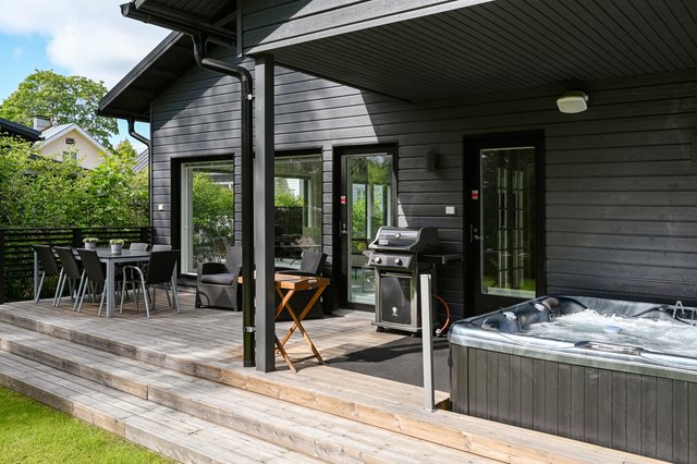 Laaja terassi tarjoaa upeat puitteet kesäpäivien viettoon ja illanistujaisiin. Katetulla osalla on KuohuSpa Hyökyallas viidelle hengelle, jossa voi nauttia lämmöstä ja rauhasta ympäri vuoden.