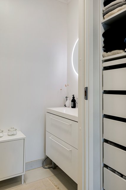 - Lattialämmitys, pöytätaso, pyykkikaapit, tila pesutornille, pesuallas, ja pesukoneliitäntä