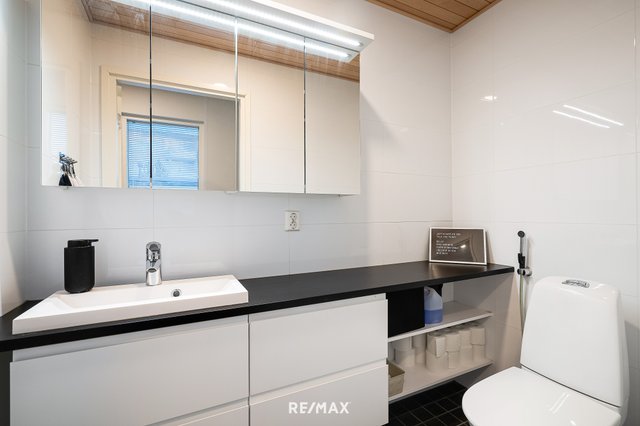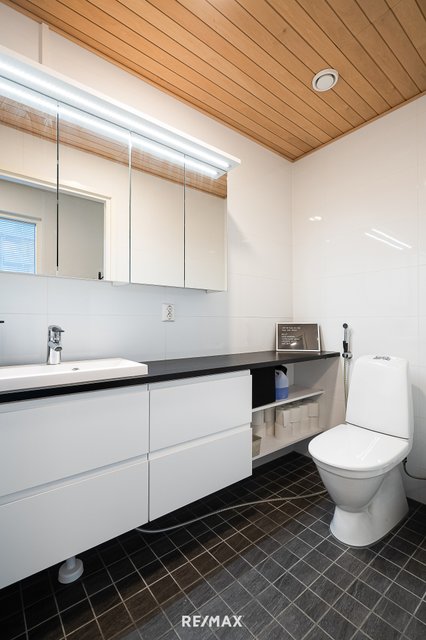 - WC-istuin, suihku, suihkuseinä, pesukone, pesukoneliitäntä, lattialämmitys, peilikaappi, pesuallas, allaskaappi, ja bidee-suihku