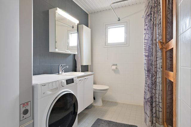 - Suihku, wc-istuin, pesukoneliitäntä, peilikaappi, pesuallas, allaskaappi, ja lattialämmitys