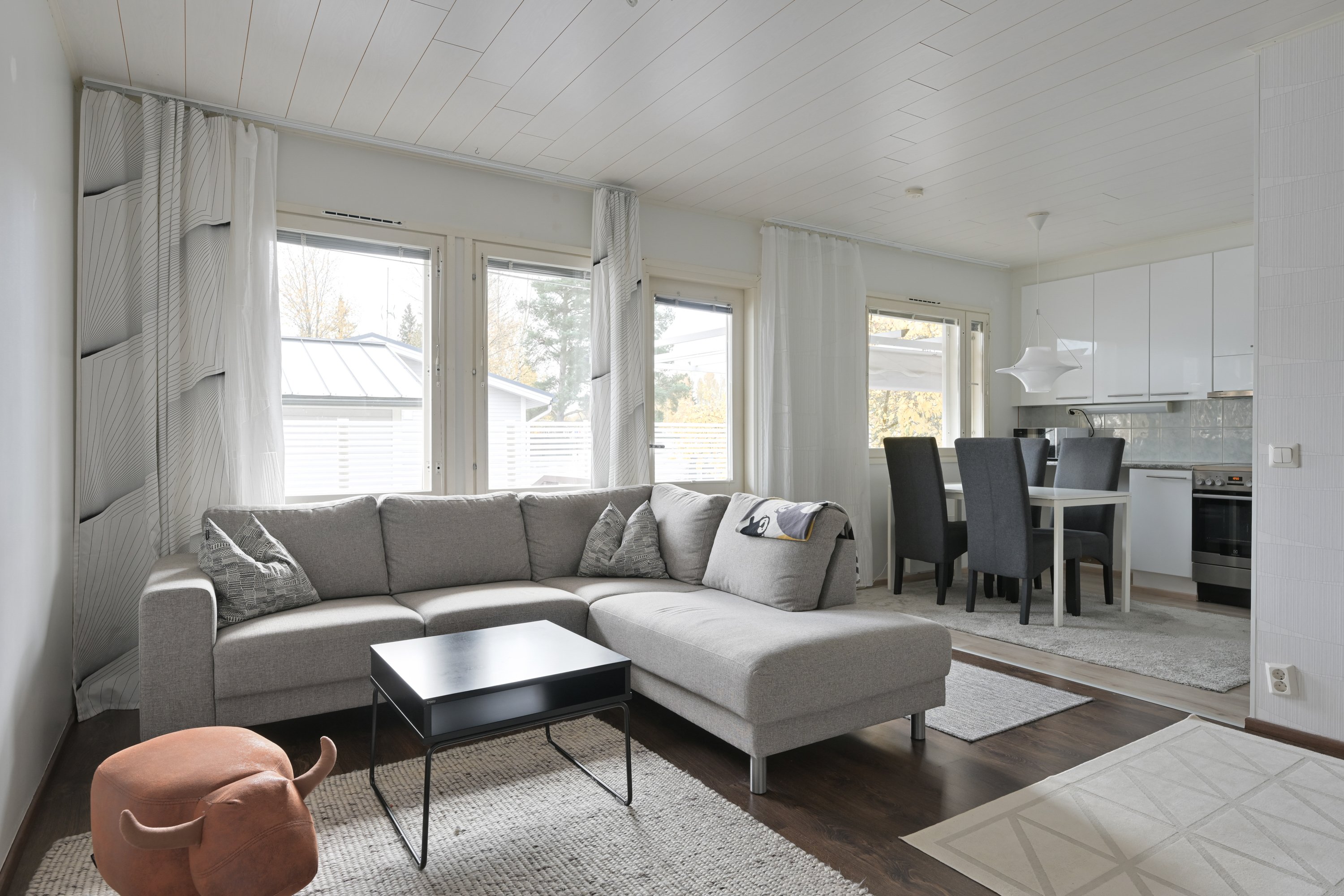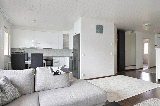 Sisääntulon yhteydessä on tilava eteinen säilytystiloineen, josta kulku jatkuu valoisaan ja viihtyisään oleskelualueeseen, jossa olohuone ja ruokailutila yhdistyvät luontevasti toisiinsa. Keittiö on vaalea, siisti ja toimiva ja siinä on hyvin kaappi- ja laskutilaa. Ilmalämpöpumppu tuo asumiseen mukavuutta ja energiatehokkuutta ympäri vuoden.