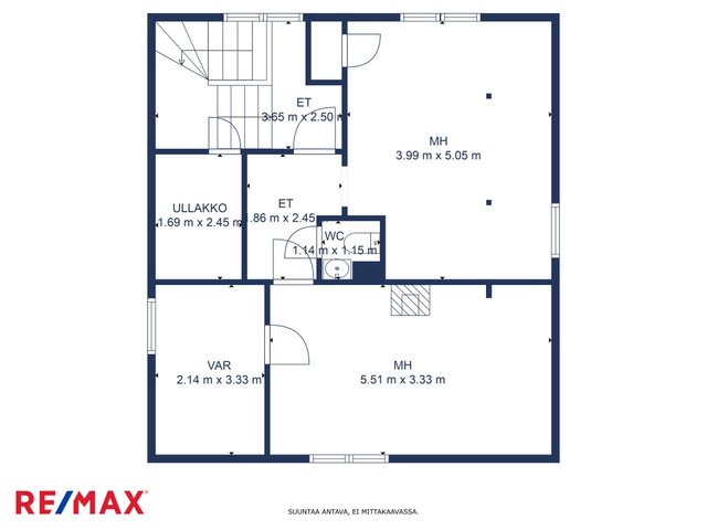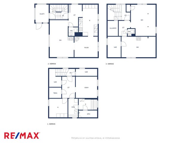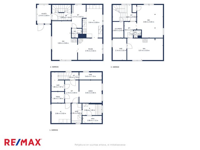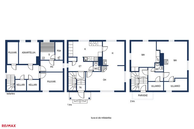 - Asuintilojen pinta-alassa on mukana keskikerroksen tilat ja yläkerrasta alkuperäisten makuuhuoneiden tilat (ei ole huomioitu korkeuden puolesta vanhoja ullakkotiloja, jotka yhdistetty makuuhuonetiloihin. Muiden tilojen pinta-alassa on mukana kellerikerroksen tilat. Ei tarkistusmitattu. Pinta-alat saattavat tämän ikäisissä kohteissa (rekisteröity ennen 01.01.1992) poiketa olennaisestikin asuinrakennusten nykyisten mittaustapojen ja standardien (SFS 5139) mukaan laskettavasta asuintilojen pinta-alasta. Pinta-ala voi siis olla edellä mainittua pienempi tai suurempi.