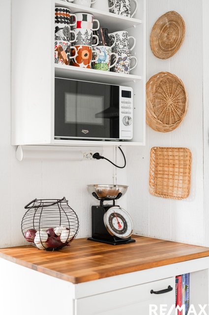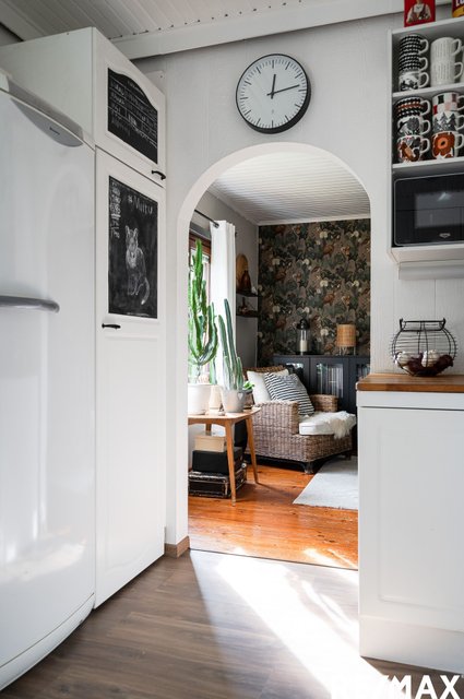 - Jääkaappi, pakastin, hella, uuni, astianpesukone, liesituuletin aktiivihiilisuodatin, puutaso, kaapistot, Lattia: laminaatti, Seinät: maalattu sisustuslevy