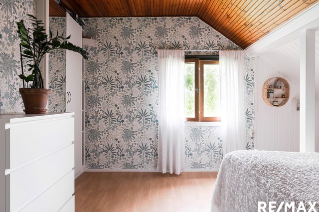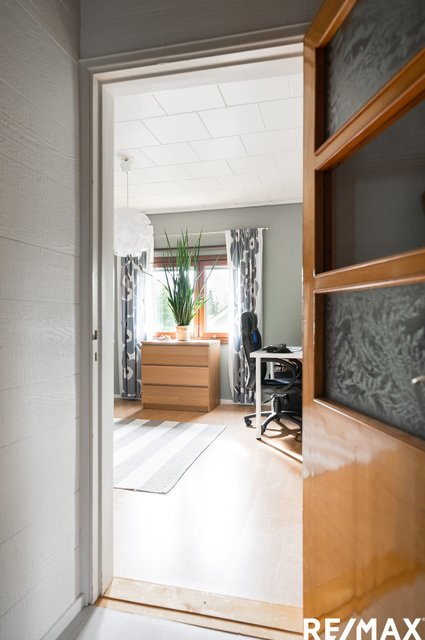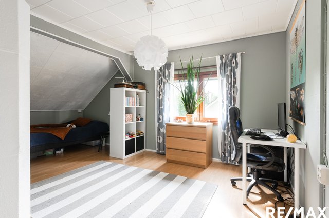 - Yläkerrassa kaksi makuuhuonetta. Lattiat laminaattiat ja seinät maalattu.